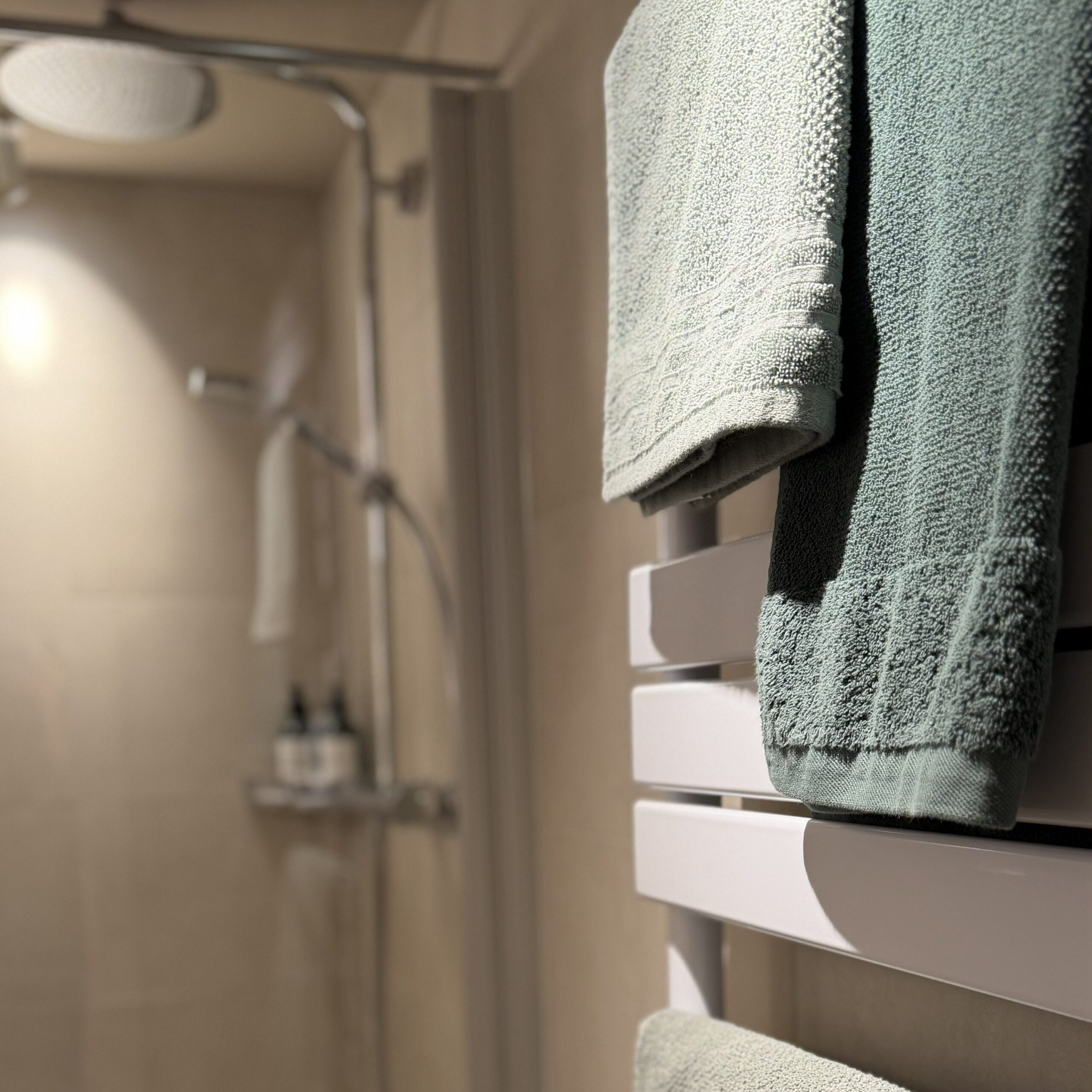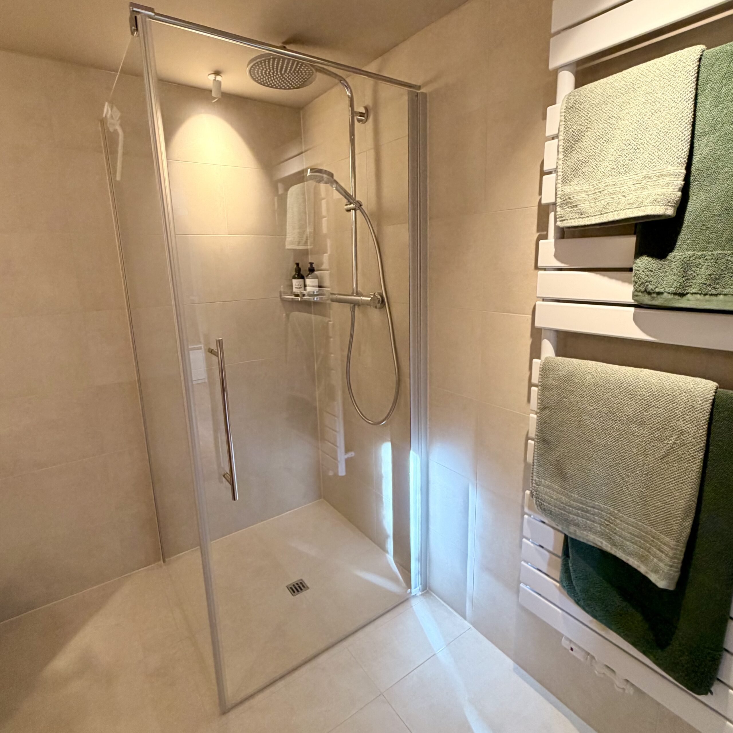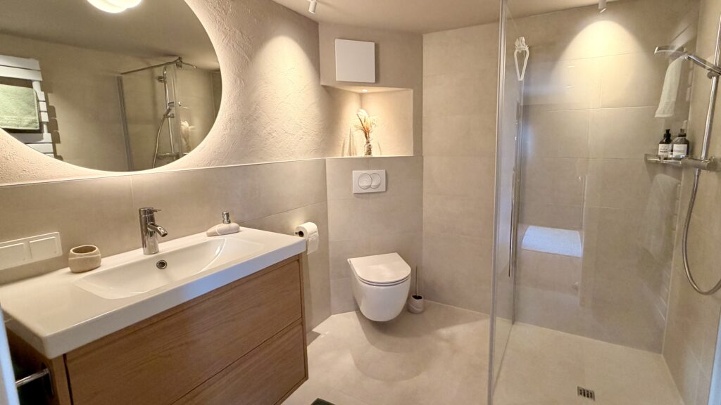 Im Bad erwarten Dich eine begehbare Dusche, WC, Föhn sowie Seife, Duschgel und Shampoo – Handtücher und Bettwäsche sind selbstverständlich inklusive.