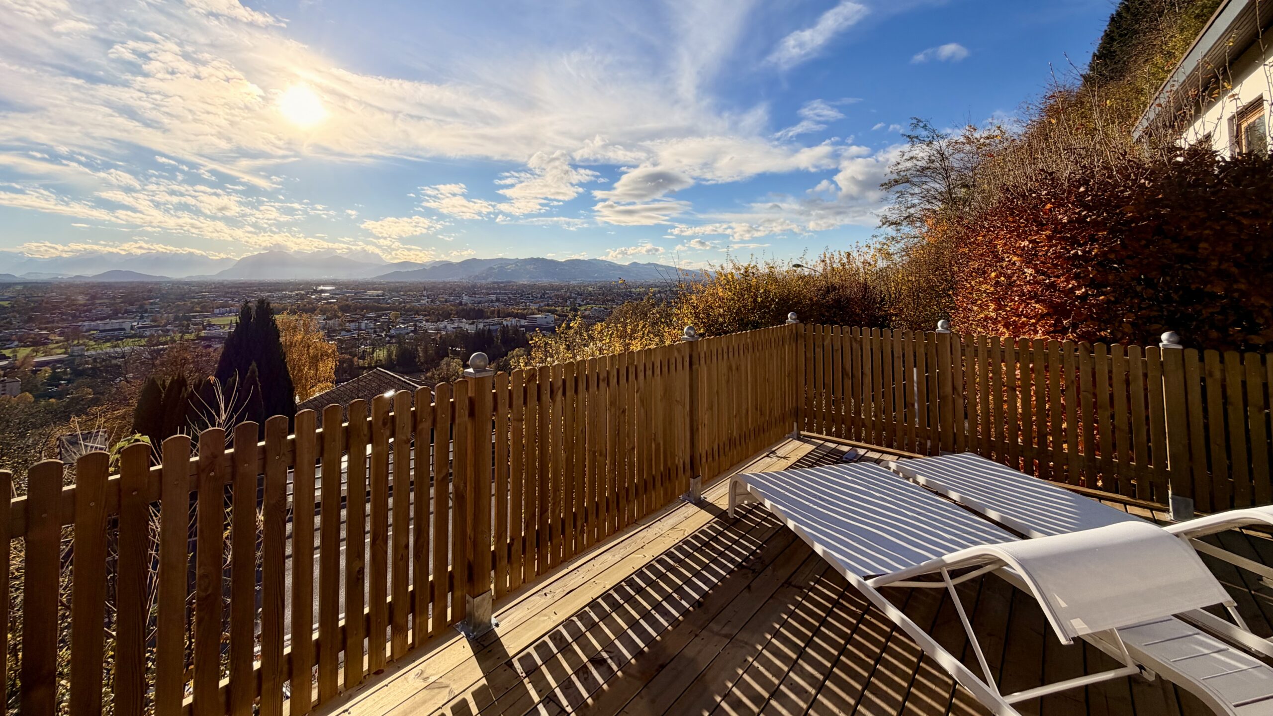 Das Highlight: eine rund 30 m² große Terrasse mit Esstisch, Stühlen und einer bequemen Doppelliege – perfekt für ein Frühstück in der Morgensonne oder ruhige Stunden mit Blick auf die Berge. Die Terrasse liegt etwas erhöht über der Landstraße, was den schönen Ausblick erst möglich macht. Beachtet bitte dass dort jedoch Strassenverkehr hörbar ist.